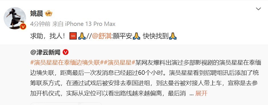 1月5日,自称是演员王星女友的网友嘉嘉利用社交账户“失眠爹地”在社交平台上发文求助,称男友王星在某演员接戏群收到组讯,添加演员统筹微信并试戏成功后,决定前往泰国进组。1月3日,北京时间凌晨4点,王星乘飞机从中国上海浦东直飞到达泰国曼谷素万纳普机场,后乘坐上演员统筹安排的车辆,北京时间1月3日中午12时许在泰缅边境失联。