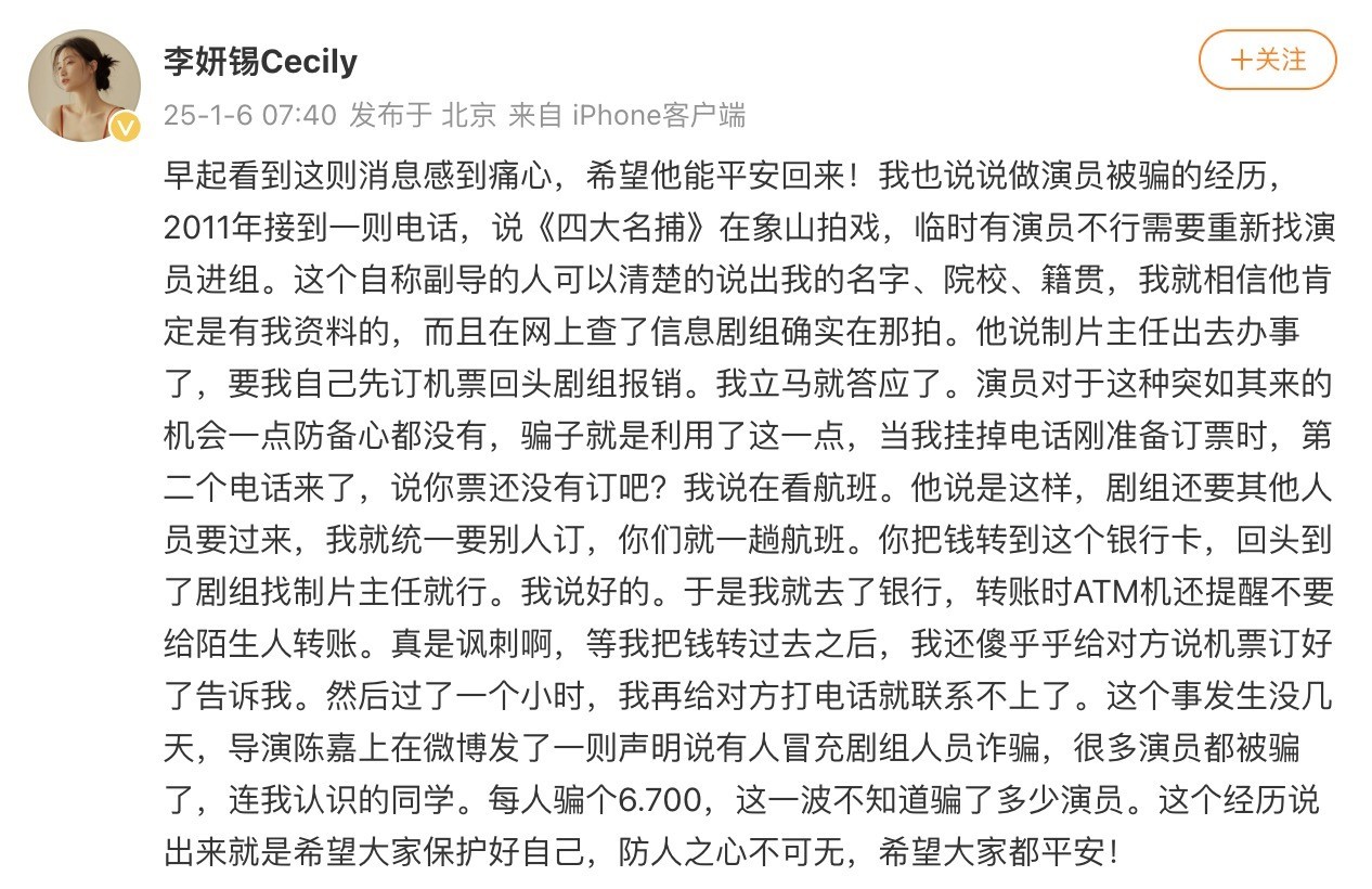 演员李妍锡则透露了自己曾经的被骗经历,“2011年接到一则电话,说《四大名捕》在象山拍戏,临时有演员不行需要重新找演员进组。这个自称副导的人可以清楚地说出我的名字、院校、籍贯,我就相信他肯定是有我资料的,而且在网上查了信息剧组确实在那儿拍。他说制片主任出去办事了,要我自己先订机票回头剧组报销。我立马就答应了。演员对于这种突如其来的机会一点防备心都没有,骗子就是利用了这一点,当我挂掉电话刚准备订票时,第二个电话来了,说你票还没有订吧?我说在看航班。他说是这样,剧组还要其他人员要过来,我就统一要别人订,你们就一趟航班。你把钱转到这个银行卡,回头到了剧组找制片主任就行。我说好的。于是我就去了银行,转账时ATM机还提醒不要给陌生人转账。真是讽刺啊,等我把钱转过去之后,我还傻乎乎给对方说机票订好了告诉我。然后过了一个小时,我再给对方打电话就联系不上了。”